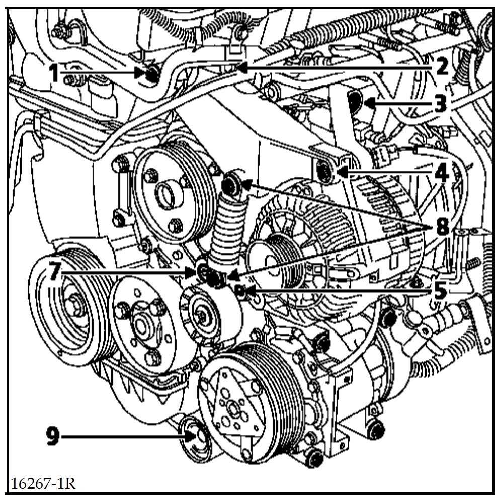 1. Alternator upper support mounting bolt - 38Nm + 0.4