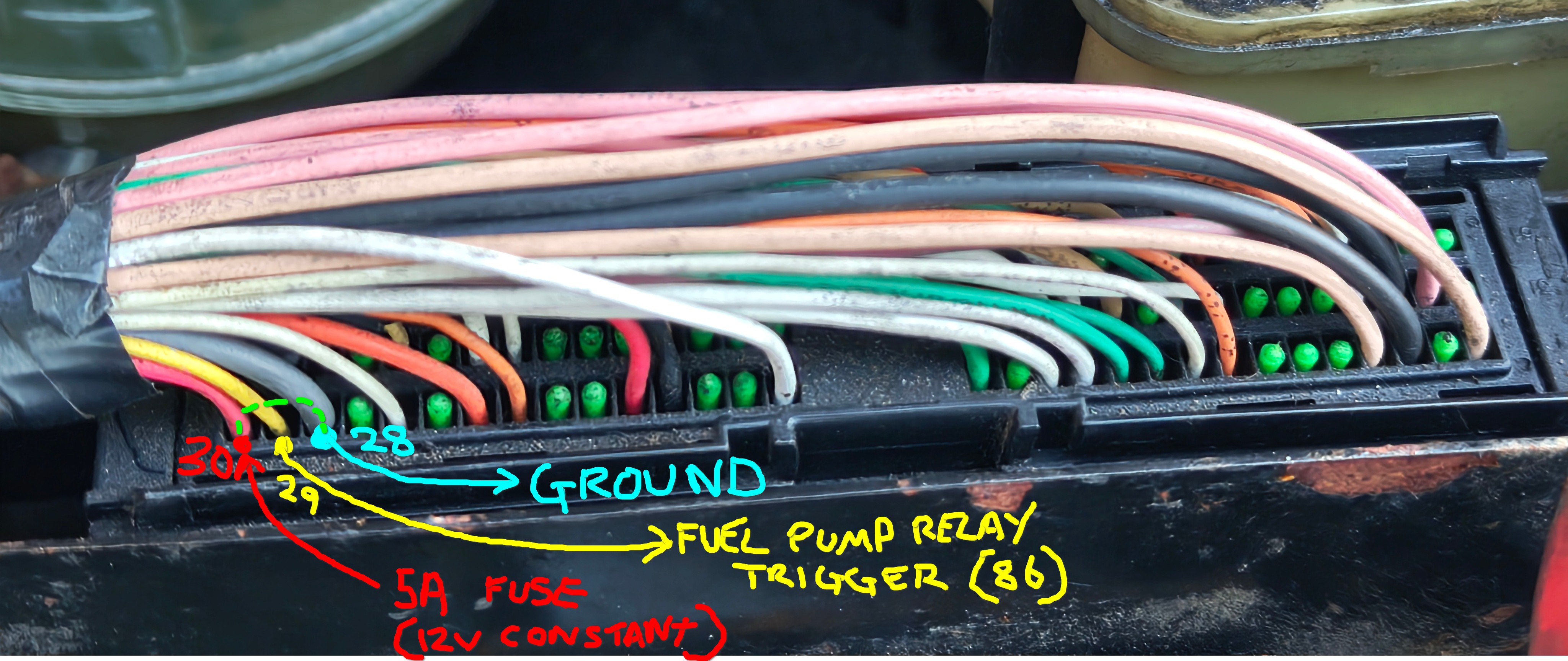 A second observation is that there is continuity through the ECU between pin 30 (our 5A fuse) and pin 28 (ground wire). Which explains why the fuse goes to ground when the harness is connected, the ECU is bridging pin 30 to ground. So question 2....is this also expected?