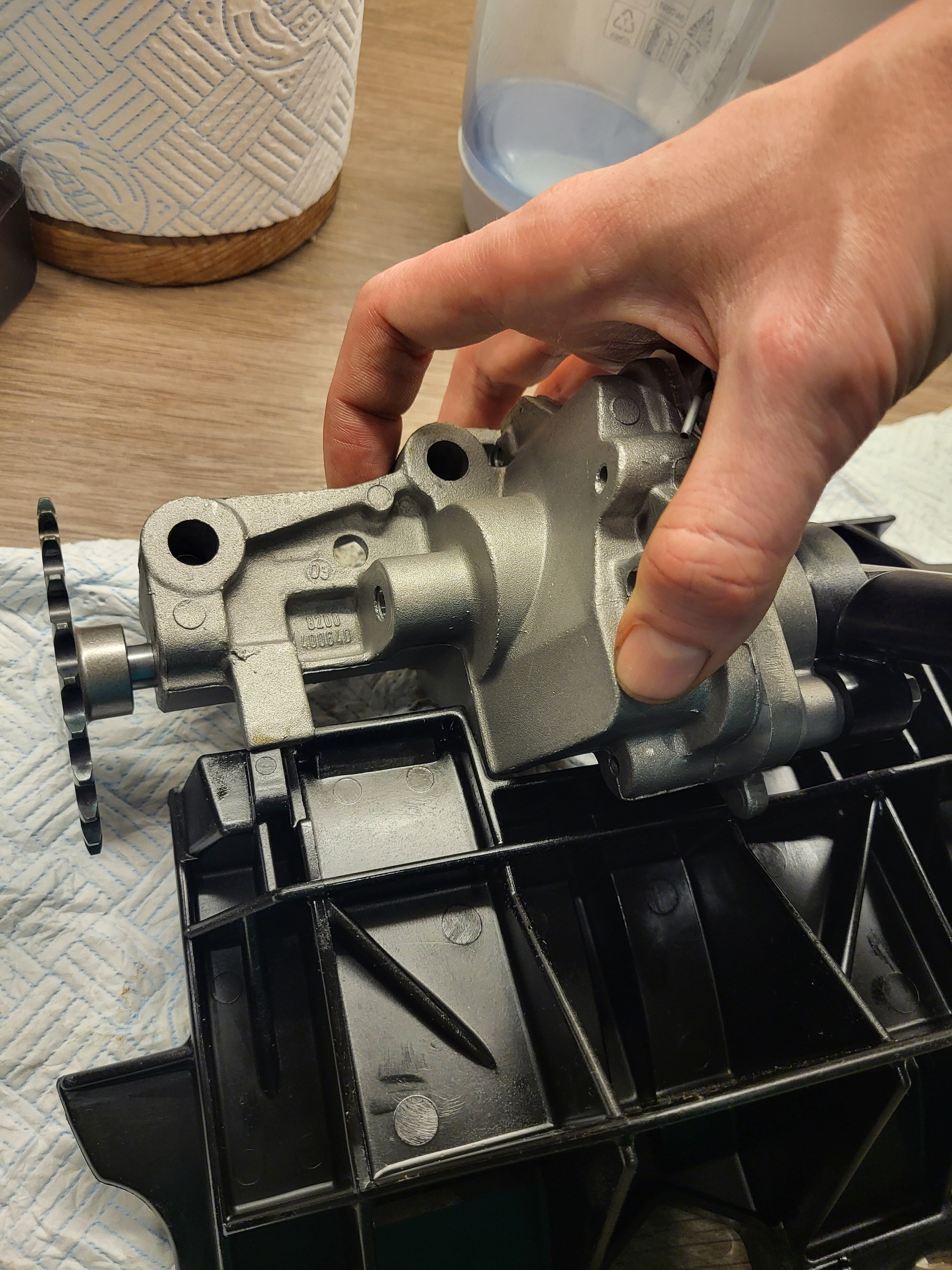 Im just attempting to fit the plastic windage tray following fitting the larger oil pump. The tray fouls on the oil pump before it even gets near the mounting lugs or hole.
