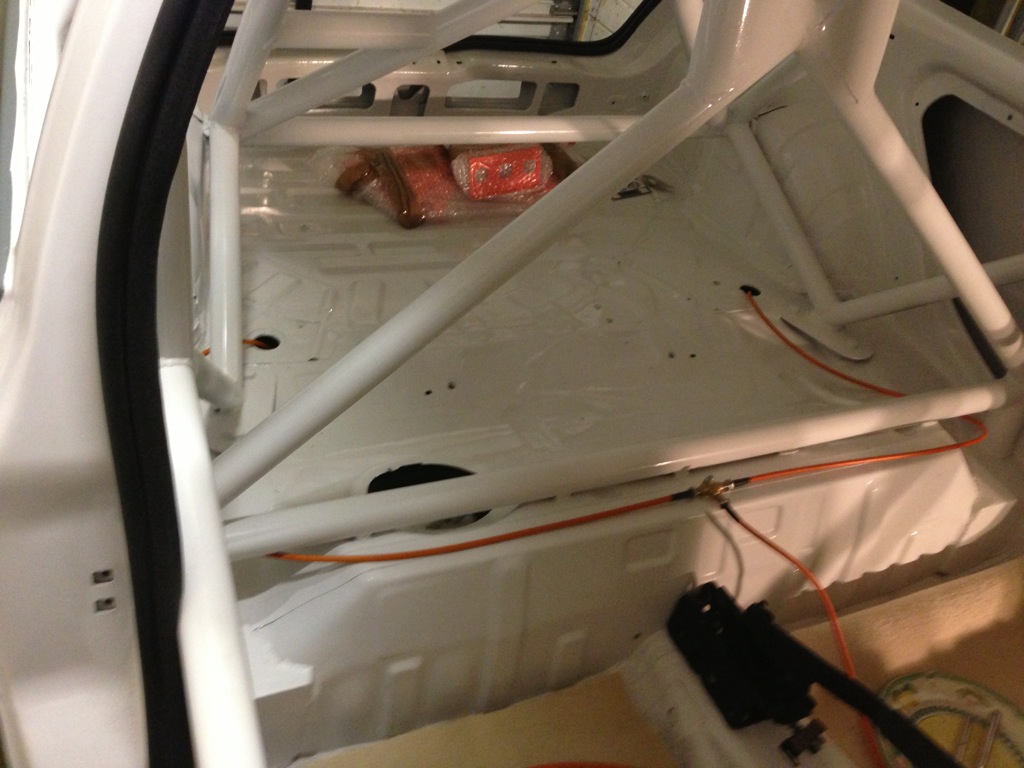 Right so as I showed a few days ago I collected the shell on Monday after it had spent the weekend drying after painting. While there it had the new seat rails fitted at the correct spacing apart which now gives much more flexibility, a few areas of missing welds on the cage were sorted, the central tunnel was modified to relocate the linkage further forwards. This involved cutting the strengthening bar from under the car but this has been replaced with 2 bars laterally one in front and one behind the gearstick. The plate was then double skinned with a Genny used to create extra strength in the top panel.