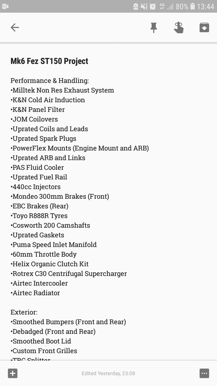 I'm 6 foot 6 and the list is only performance and Handling mods, I have a whole lot of other stuff on the list I wish to do as well but I didn't bother posting it up but I suppose I can do it just now for the benefit of readers!