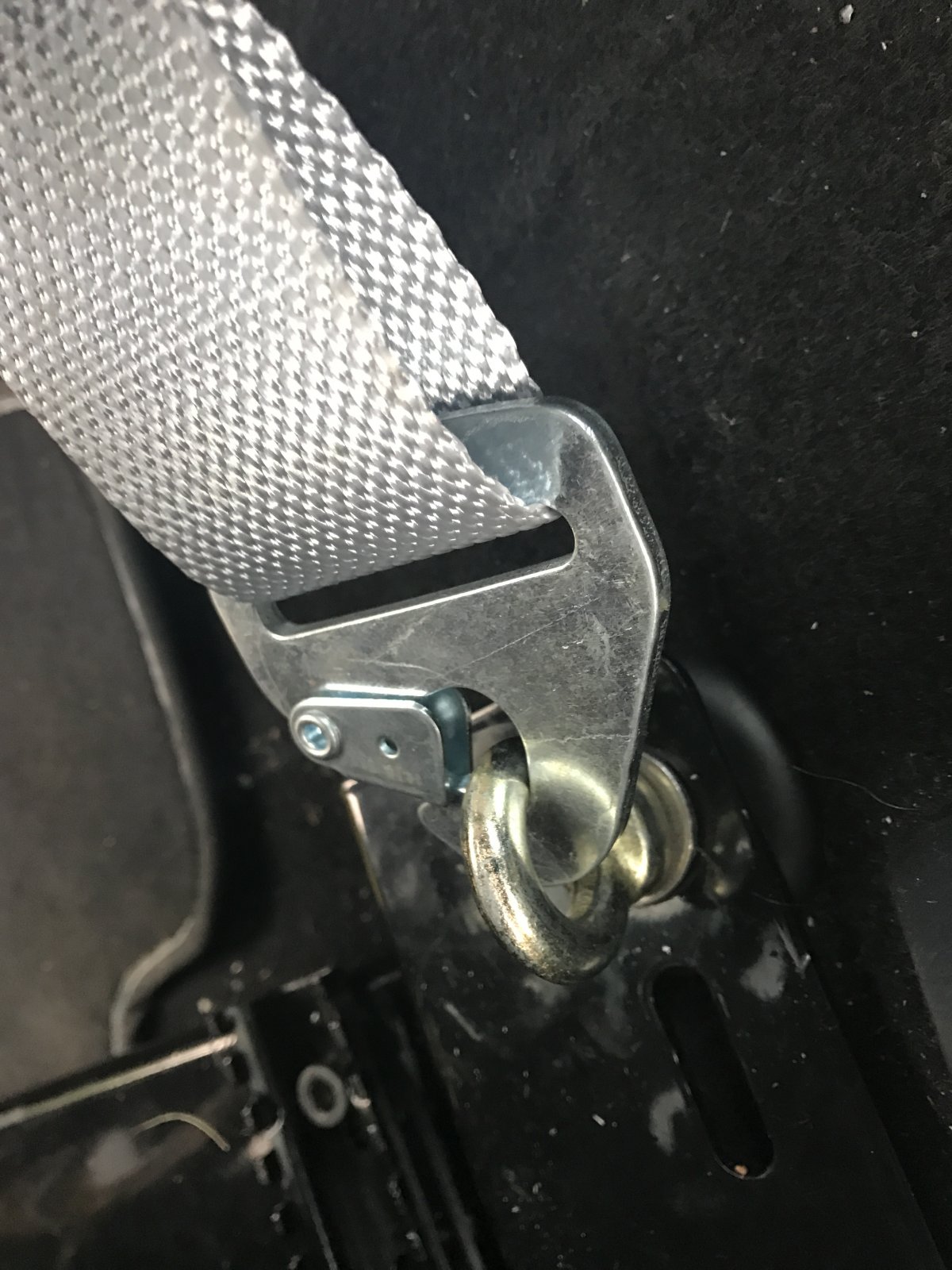 I left the standard plastic spacers on that were under the original seats and replaced one of the subframe bolts with an eyelet and spreader plate which I have hooked a seatbelt clip to to retain standard belts until I have a cage to mount harnesses correctly.
