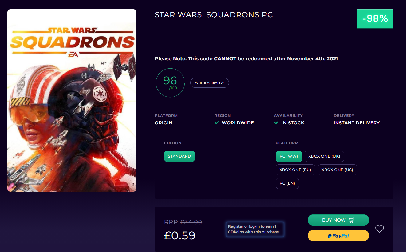 Buy STAR WARS: Squadrons PC CD Key. Digital code delivered instantly. Best prices on game keys. Get your STAR WARS: Squadrons PC code now at Loaded.www.cdkeys.com