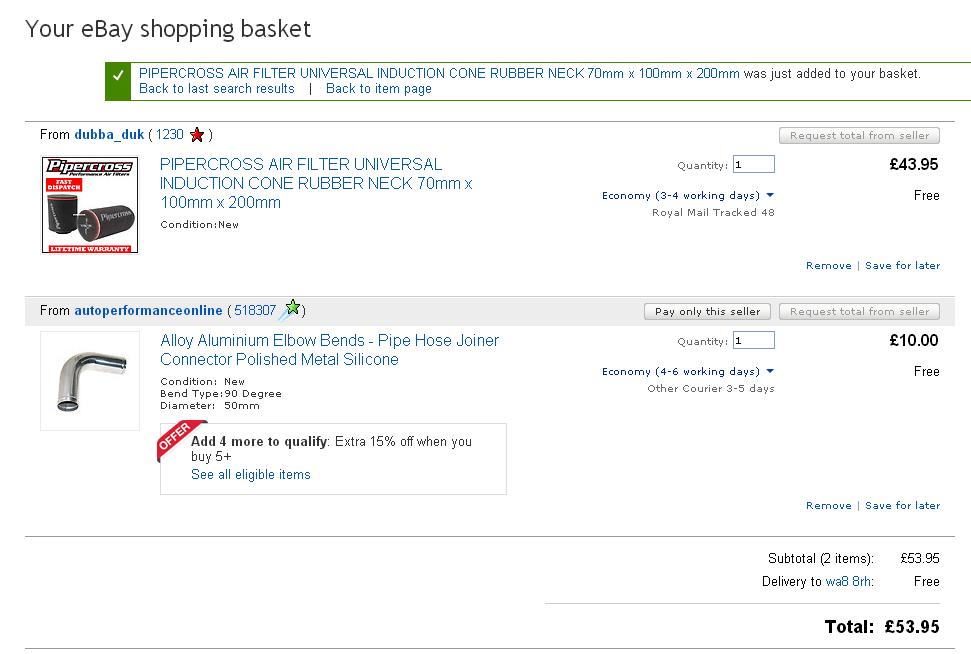 Or you can buy x2 150mm (legs) 90deg aluminium bends, maybe a 100mm straight incase extra length is required somewhere, x1 100mm straight hose (cut in half) and a filter all 70mm plumbing. Get someone to weld the pipes for you at the required angle. This will be enough to get the filter in the bumper. This will be a lot cheaper than using silicone pipes and less prone to any collapsing. I would have done this myself yesterday but as there was already some form of induction setup there I utilised that somewhat to get the same outcome.