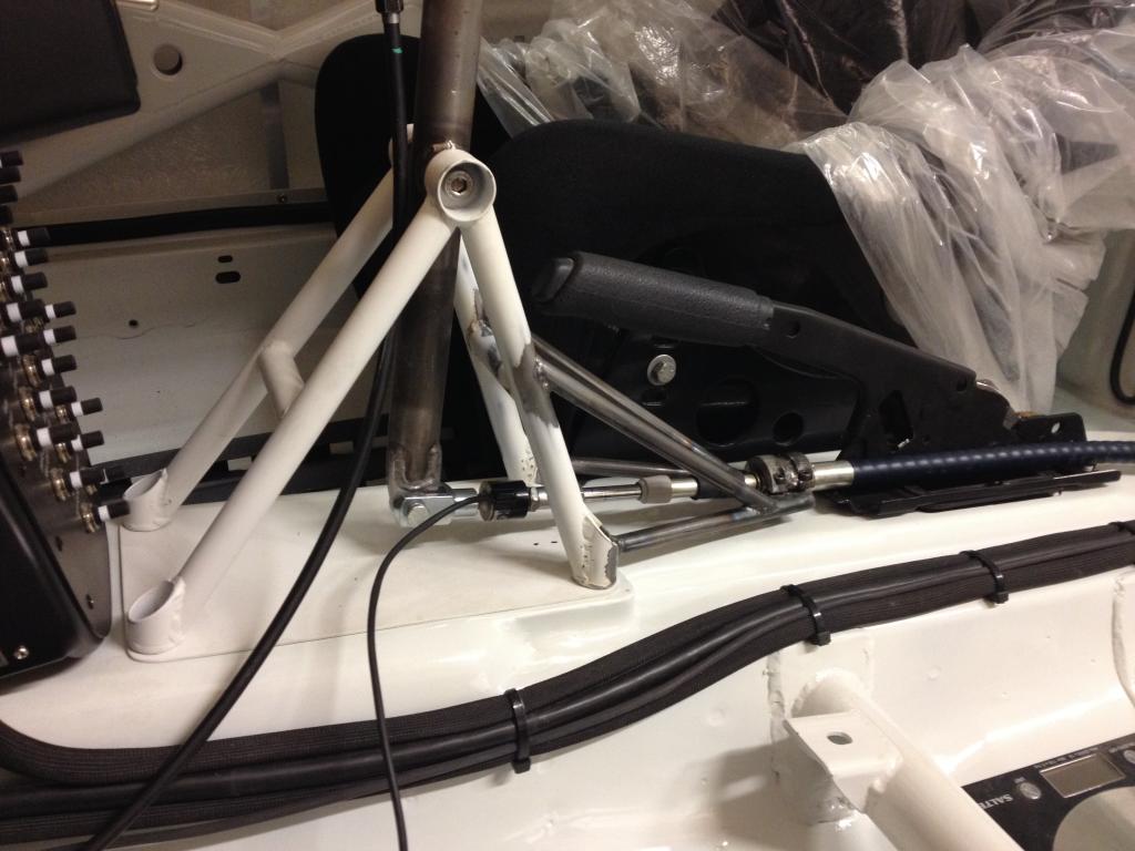 Due to the sequential box being an afterthought, a few things meant I couldn't use the standard metal pushrod for the gear change. The additional X brace on the bulkhead looks like it would probably have been in the way and the mother of a switchpanel was most definitely a show stopper, given the time it took to built that I didn't really want to start over.
