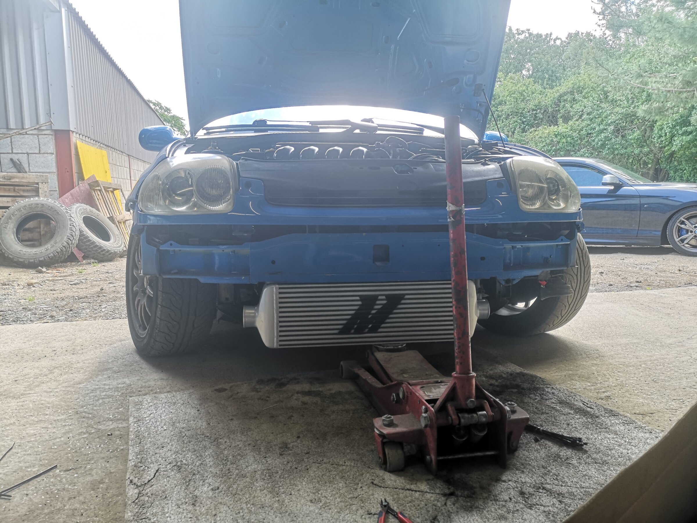 Got the intercooler offered up to the car, the mishimoto one is quite abit bigger than the normal ebay ones so the crash bar will need modifying so the intercooler sits higher and then brackets made to mount it.