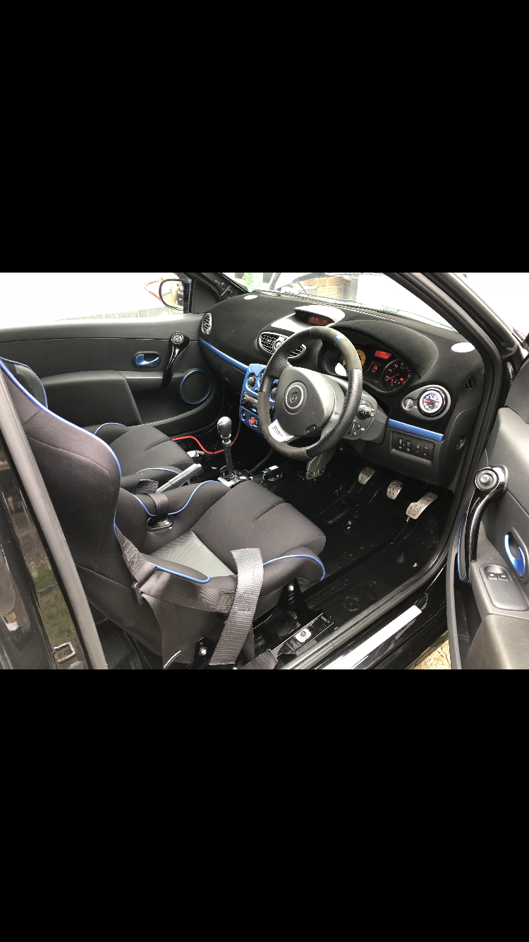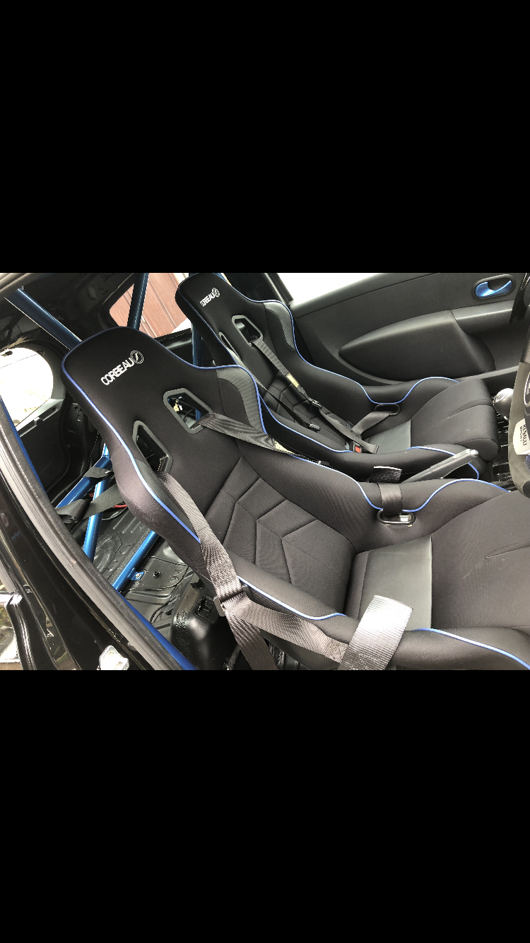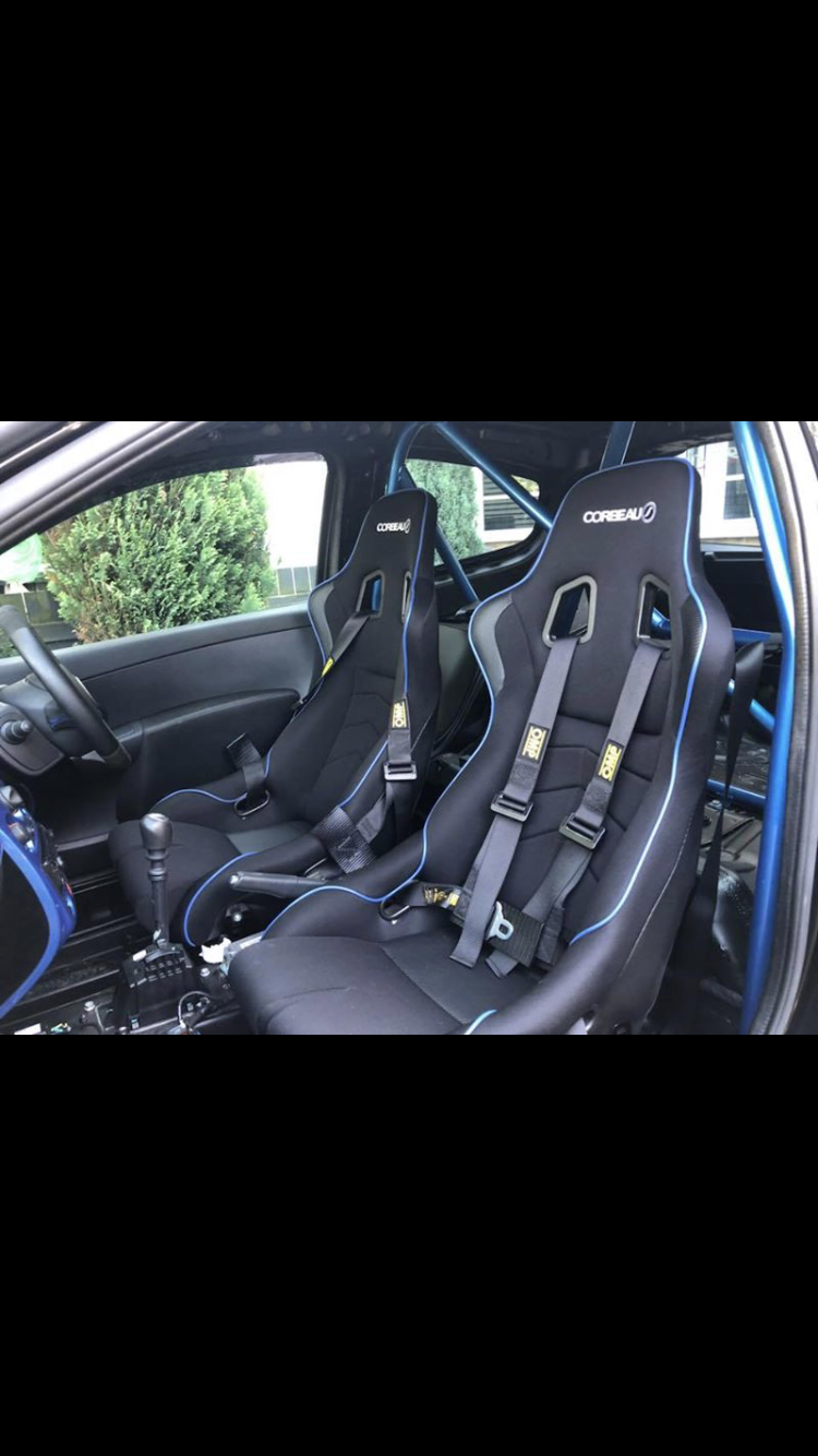 Rentune bucket seat single peice mounting set with matching pristeen Corbeau DFX bucket seats, secured with OMP 3 point harness’.