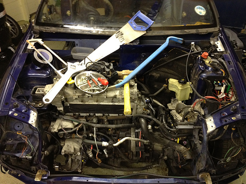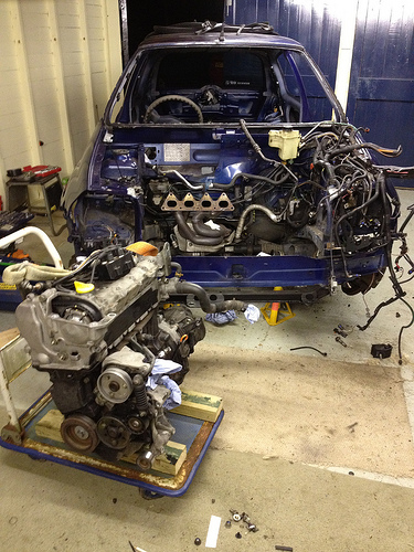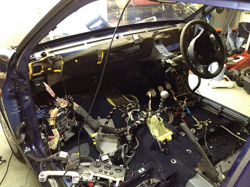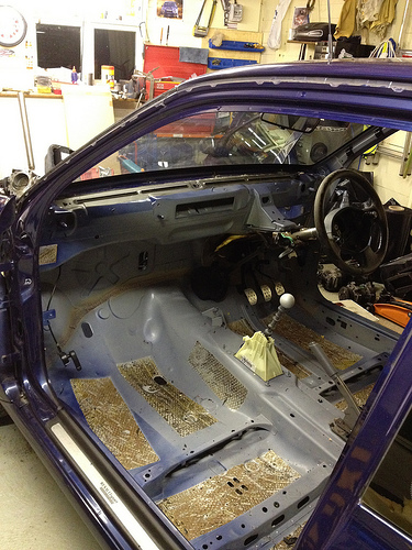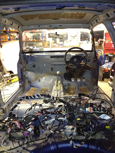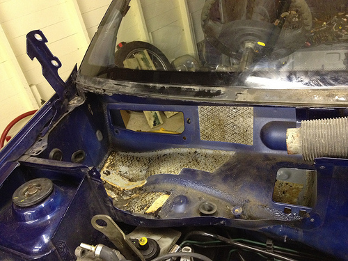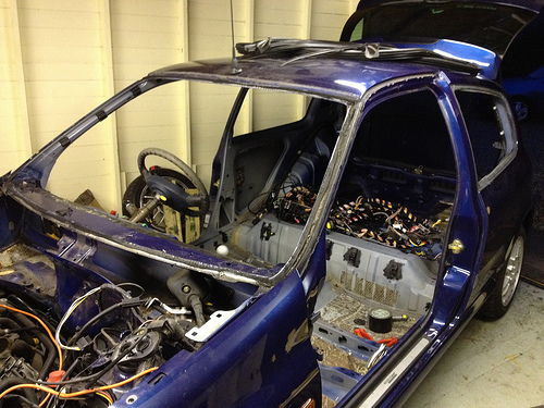 The dashboard and steering wheel is out now, so is the front bumper and headlights etc. Hopefully Wednesday I will crack on and remove the windscreen, passenger side rear glass and the boot lid. Then moving on through the week I need to be getting the water drained out of the engine to remove the heater and then get the engine and gearbox out along with the whole wiring loom so then, fingers crossed, sometime late next week I can send the shell off to have the cage put in (this should be here this week) then on the car returning, get the interior sprayed! Long way off this yet though