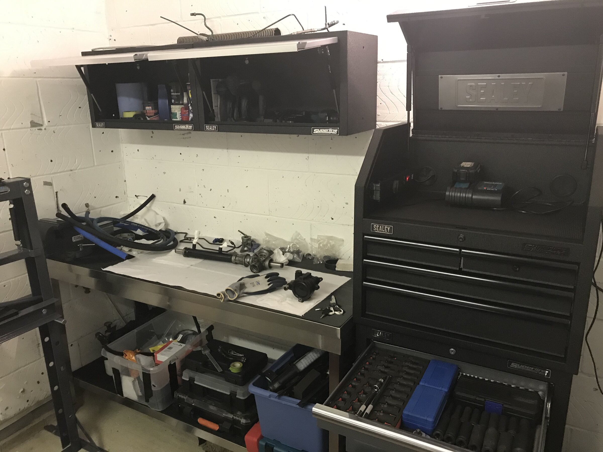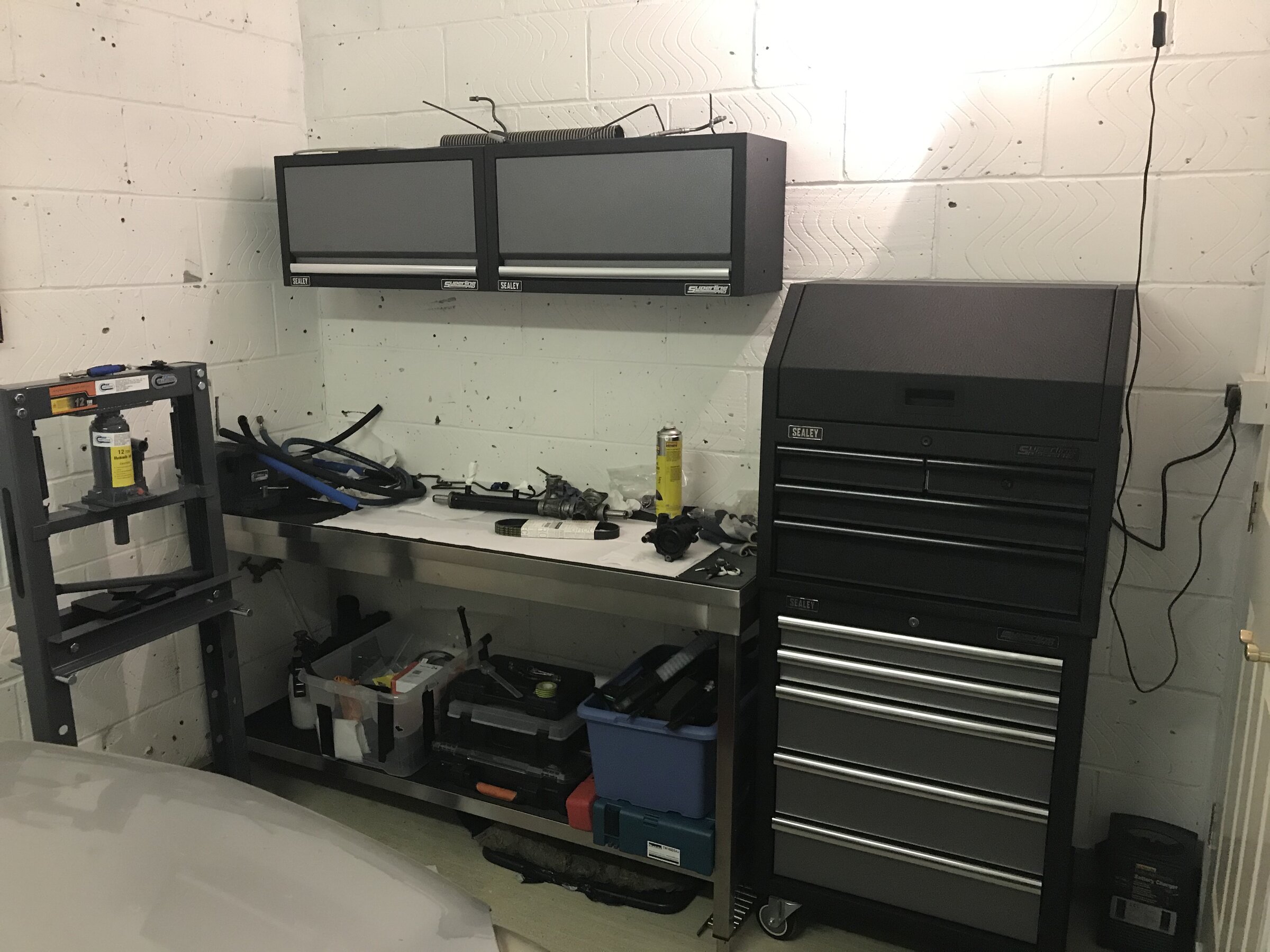 Then put in weatherproof carpet, heavy duty shelves and either a metal or wooden workbench and a vice.
