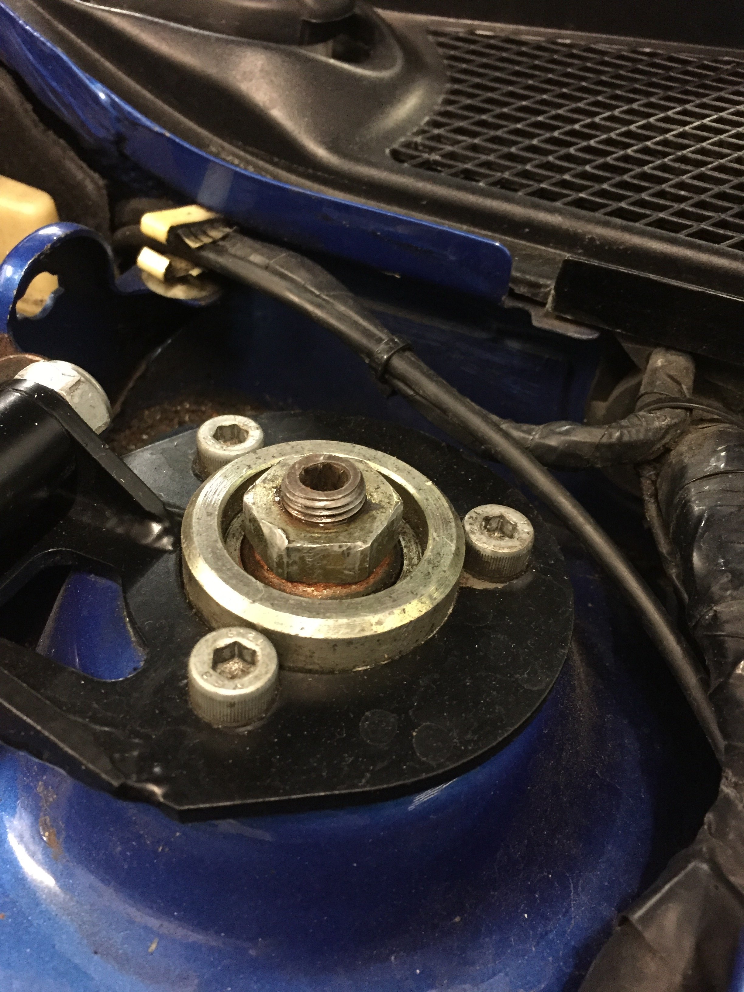 I've been tinkering and had the car jacked up looking around and looking at the dampers etc. What I noticed was that it appears as though the knocking is coming from the top mount solid bearings. They're moving up and down within the bearing cup.