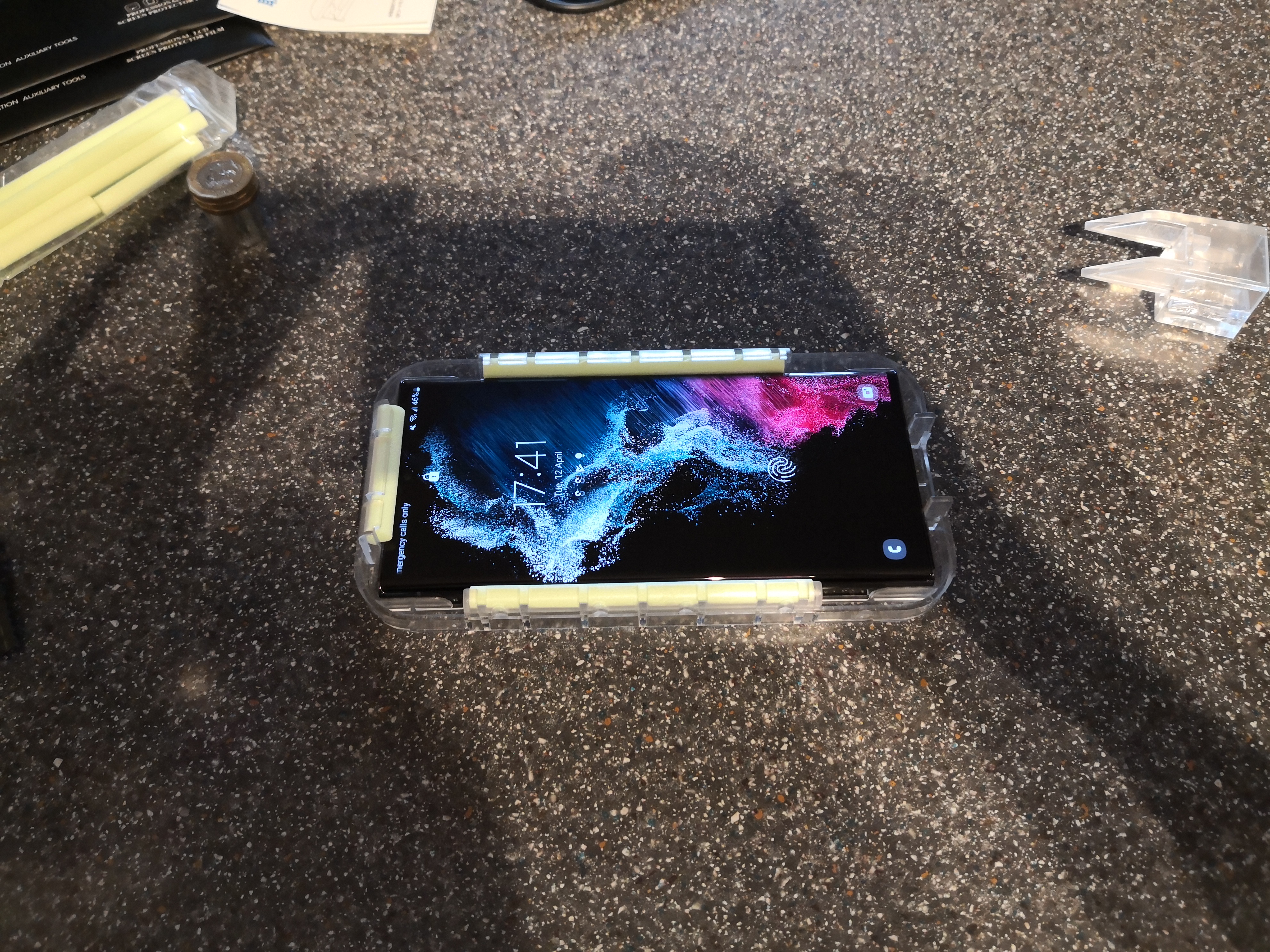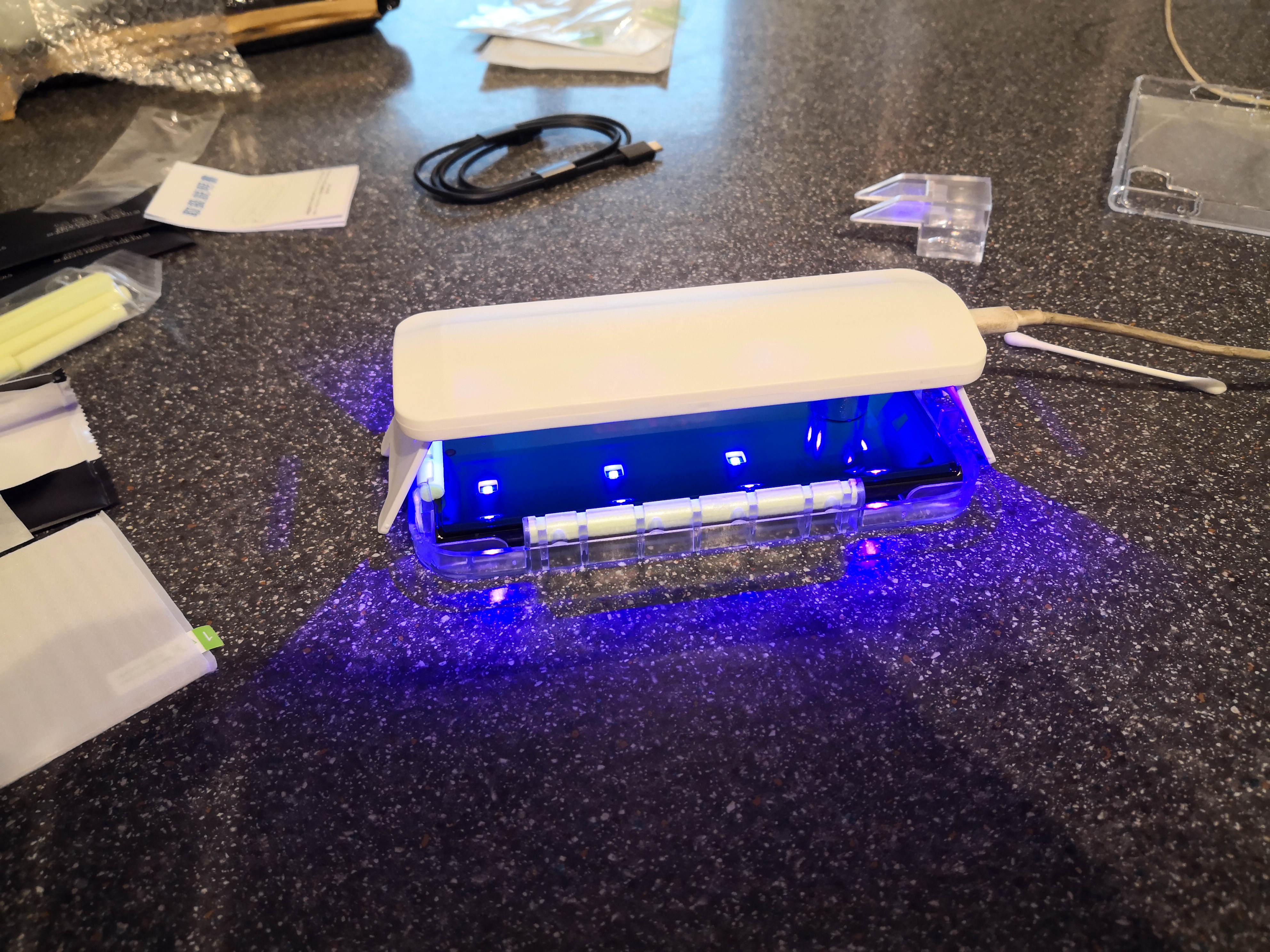 First things first I stuck a uv glass screen protector on it. Can't believe how well this one went. No bubbles or anything.
